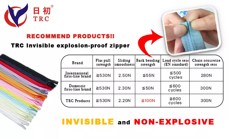 Hver TRC usynlig eksplosionssikker lynlås bliver omhyggeligt inspiceret gennem hele produktionen, fra valg af råmateriale til slutmontering. Strenge tests for trækstyrke, glathed og holdbarhed sikrer ensartet ydeevne, hvilket giver dig en pålidelig lynlås, der opfylder internationale kvalitetsstandarder.