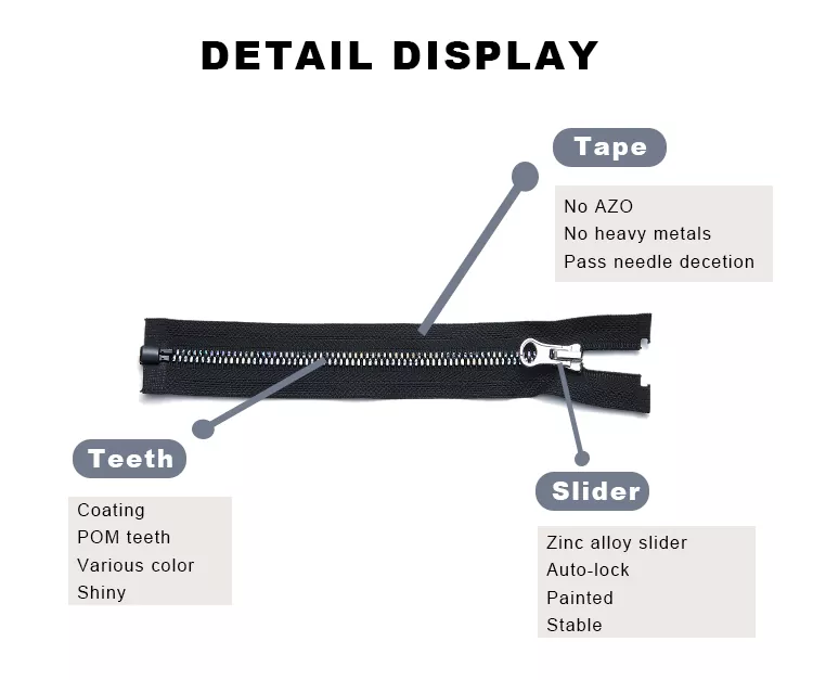 Beskyttende belægning – forbedrer oxidationsbestandighed og korrosionsbestandighed, hvilket giver lynlåsen et mere raffineret og æstetisk udseende.